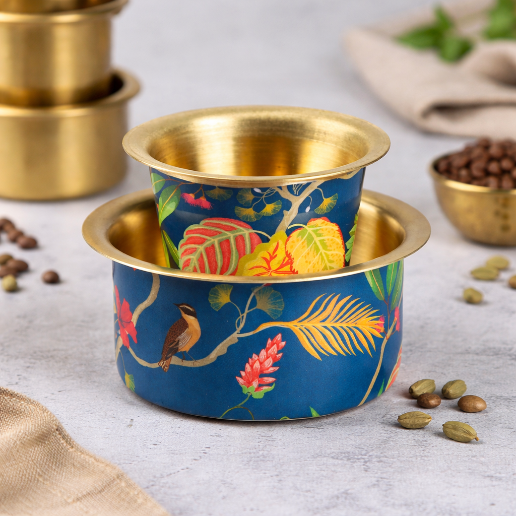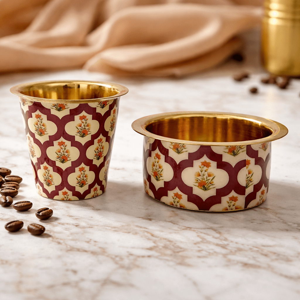 The Pure Brass Coffee Dabara Set with Meena work is a beautiful blend of traditional craftsmanship and cultural elegance, inspired by the rich heritage of South Indian coffee rituals. This set typically includes a tumbler (cup) and a matching dabara (wide bowl), designed specifically for serving and cooling filter coffee in the authentic way.