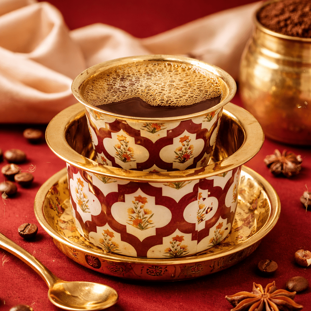 The design of the tumbler and dabara is not just decorative but also practical. The wide dabara allows the coffee to be poured back and forth between the tumbler and bowl, helping to cool the beverage while enhancing its aroma and frothy texture—an essential part of the traditional South Indian coffee experience.