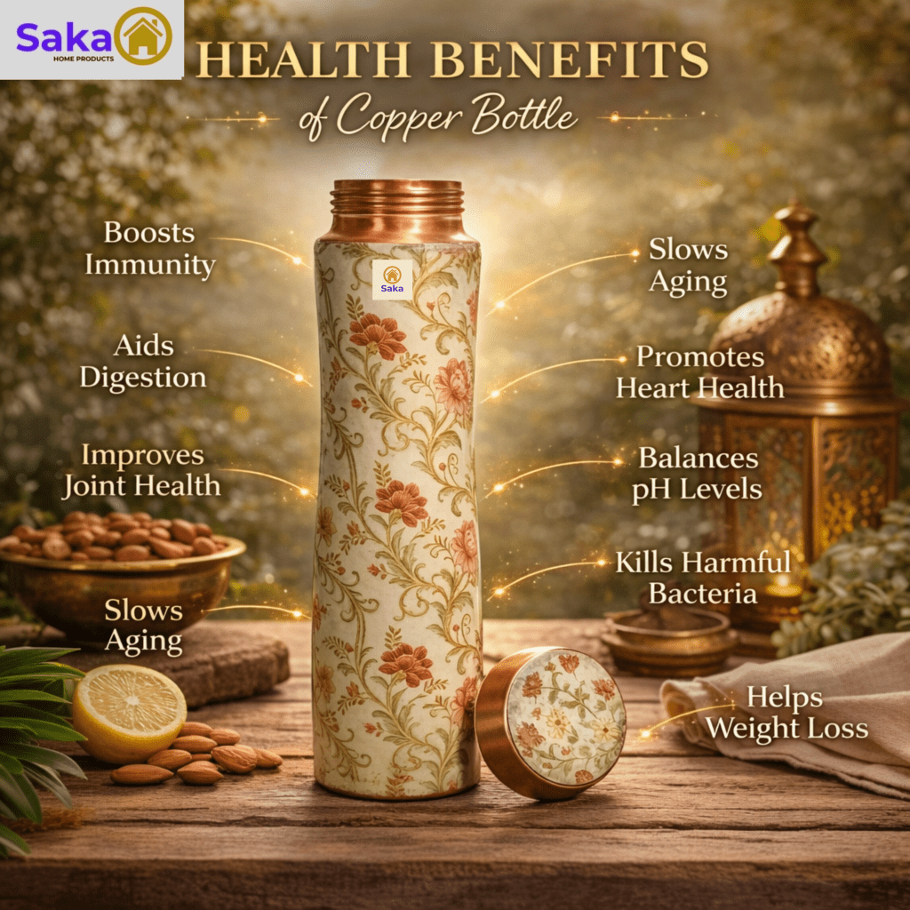 Drinking water stored in a copper vessel is an age-old Ayurvedic practice known as “Tamra Jal.” When water is kept in this bottle for 6–8 hours, it naturally absorbs beneficial copper ions that can support overall well-being.