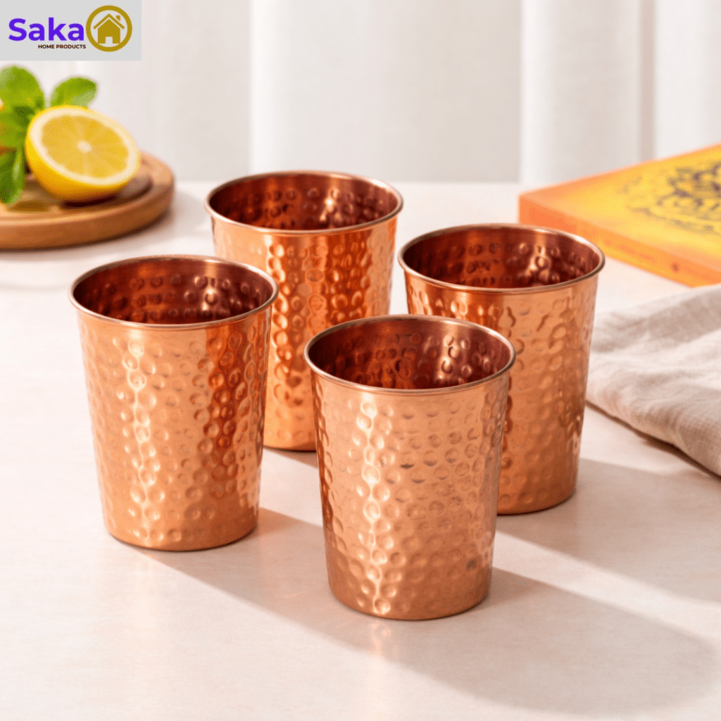 Made from high-quality pure copper, this set is designed for both beauty and functionality. According to Ayurveda, drinking water stored in copper vessels is believed to help support digestion, improve metabolism, and promote overall wellness.